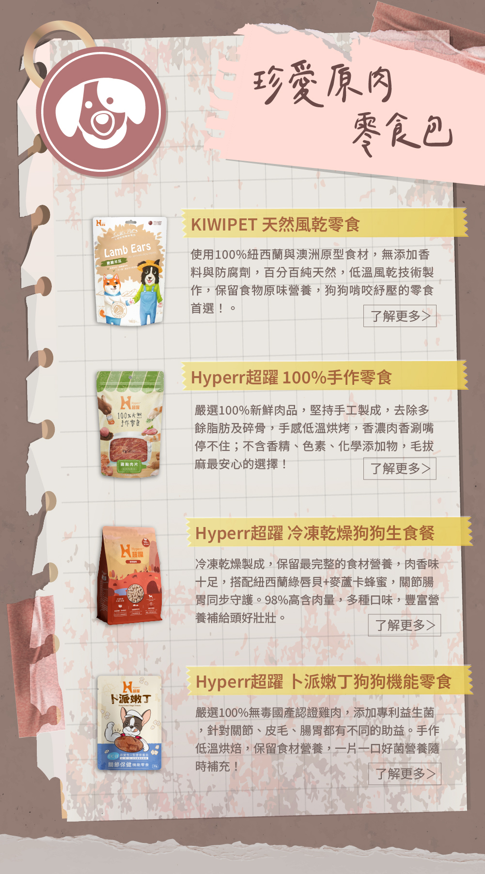叮咚!專屬狗狗的幸福天然零食組合來囉~這次幫狗狗搭配了「珍愛原肉零食」,從耐咬的風乾潔牙骨到低溫烘烤的雞肉脆片,內容超豐富,獻給狗狗一個快樂的下午茶時間!