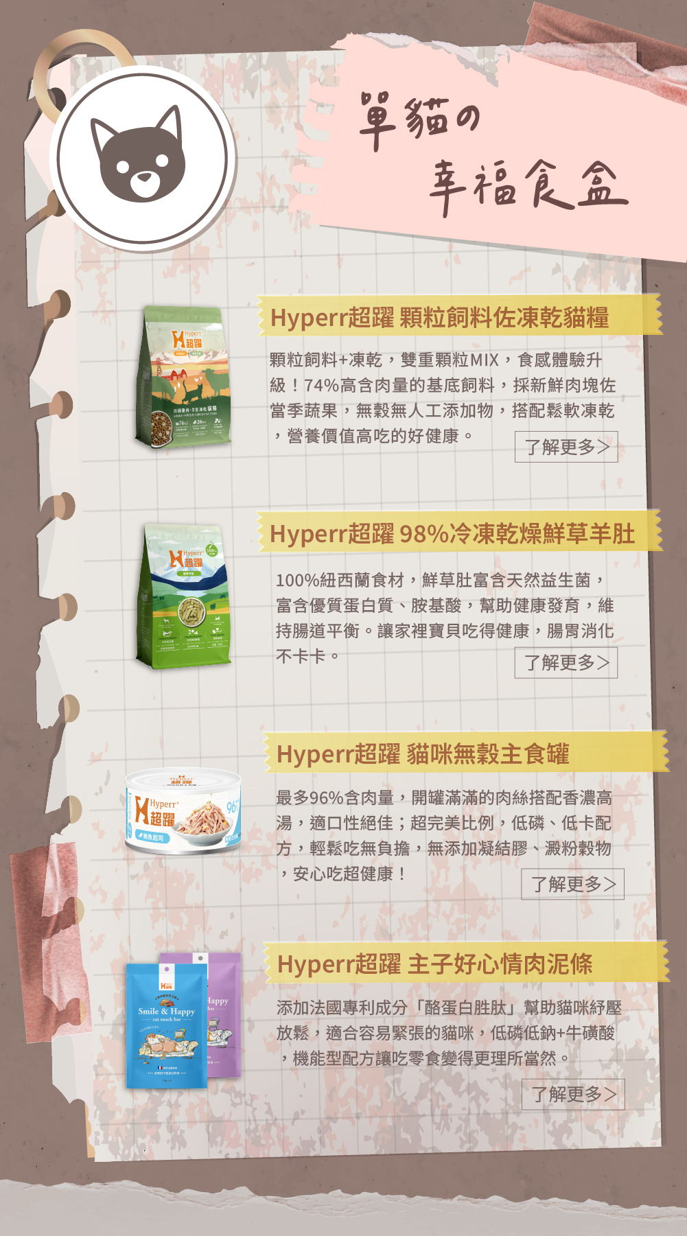 單隻貓咪不孤單,Hyperr精選幸福餐盒,包含主食、濕食、佐餐、零食應有盡有,份量充足剛剛好。吃好睡飽幸福來報到!